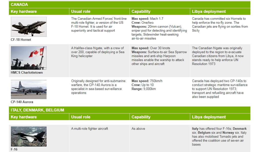 2. Canada va trimite în Libia şase avioane de vânătoare de tip CF-18,Între 120 şi 200 de soldaţi vor însoţi avioanele CF-18 (echivalentul canadian al aparatului F-18 american) -blocada maritima a Libiei 3. Marea Britanie avioane Tornado şi Eurofighter, precum şi avioane de supraveghere Nimrod.Armele de mare precizie ale avioanelor Tornado pot fi folosite pentru slăbirea bazelor de la sol, ca sisteme antiaeriene, sau pentru a împiedica trupele libiene să atace forţele rebele. "Cu Naţiunile Unite în spatele nostru, cu legalitatea evidentă a acestei acţiuni şi cu ţări din regiune care ne susţin, este corect să acţionăm. 4. Norvegia"Am decis să contribuim la operaţiune. Dar este prea devreme pentru a spune în ce mod", a declarat ea. "Este rezonabil să trimitem mijloace aeriene".Trimiterea de avioane de luptă F-16 norvegiene "este o posibilitate. Dar o mare operaţiune umanitară va fi de asemenea înfiinţată. 5. Danemarca trimiterea unei contribuţii care să includă avioane de luptă F-16, a anunţat ministrul de Externe, Lene Espersen. 6. Polonia -Varşovia : "Suntem pregătiţi să ajutăm cu avioanele noastre de transport. 7. Qatarul şi Emiratele Arabe Unite vor participa, în baza mandatului ONU, la operaţiuni militare comune împotriva regimului libian condus de colonelul Muammar Kadhafi, a declarat, joi, un diplomat acreditat la Naţiunile Unite. Consiliul de Securitate al ONU a votat joi seara, după trei zile de negocieri, o rezoluţie care autorizează folosirea forţei împotriva trupelor colonelului Muammar Kadhafi, deschizând calea unor raiduri aeriene în Libia. 8.Italia - avioane de recunoastere si baze militare pentru actiuni. 9. SUA - NU vor interveni aerian, ci vor lansa rachete Tomohawk de pe două distrugătoare capabile să lanseze rachete, Barry şi Stout. Amândouă sunt echipate cu rachete de croazieră Tomahawks. -3 submarine americane 10.Belgia s-a declarat pregătită să participe, evocând posibilitatea de a trimite "patru dintre cele şase" avioane F-16. 11. SPANIA Spania oferă un avion de realimentare şi patru avioane de luptă F-18 care vor fi trimise în Italia. LIBIA - Cu toate că este slăbit, Gaddafi s-ar putea baza pe loialitatea a 10.000-12.000 de militari, fără a uita mercenarii africani, rachetele sol-aer, tancurile şi piesele de artilerie."Dacă lumea şi-a ieşit din minţi, vom fi noi şi la fel. Vom riposta, le vom transforma viaţa într-un infern", a declarat colonelul Gaddafi